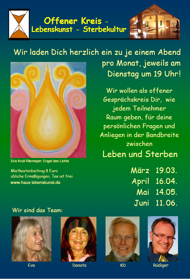 Der Offene Arbeitskreis Lebenskunst - Sterbekultur lädt einmal im Monat dienstags im Haus Lebenskunst ein zu einem Gedankenaustausch.