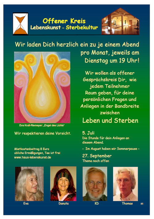 Der Offene Arbeitskreis Lebenskunst - Sterbekultur lädt einmal im Monat dienstags im Haus Lebenskunst ein zu einem Gedankenaustausch.