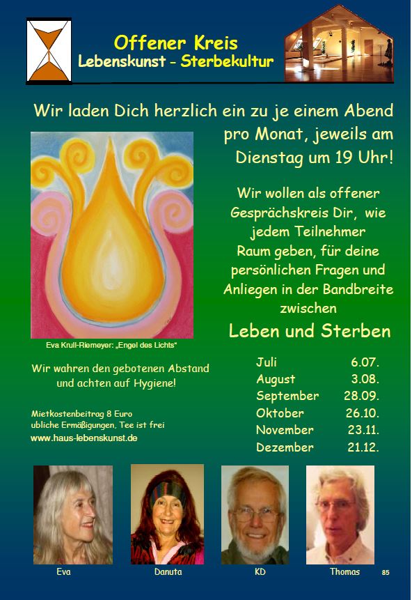Der Offene Arbeitskreis Lebenskunst - Sterbekultur lädt einmal im Monat dienstags im Haus Lebenskunst ein zu einem Gedankenaustausch.