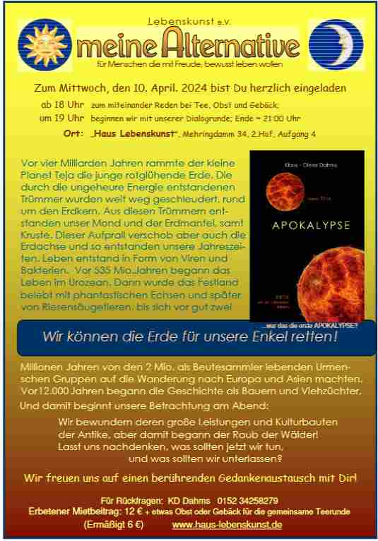 Das Team von "meine Alternative" lädt einmal im Quartal mittwochs im Haus Lebenskunst zu einem gestalteten Abend ein, immer mit Gedankenaustausch.